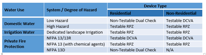 DEVICE TYPE TABLE BASED ON WATER USE AND DEGREE OF HAZARD